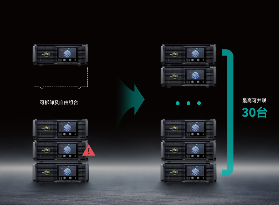 支持多機(jī)并聯(lián),最高可30臺并機(jī),采用數(shù)字控制方案,通過光纖進(jìn)行系統(tǒng)通訊,并機(jī)后不需要再校準(zhǔn);并機(jī)數(shù)量及功率可自由組合,最大化產(chǎn)品利用率。