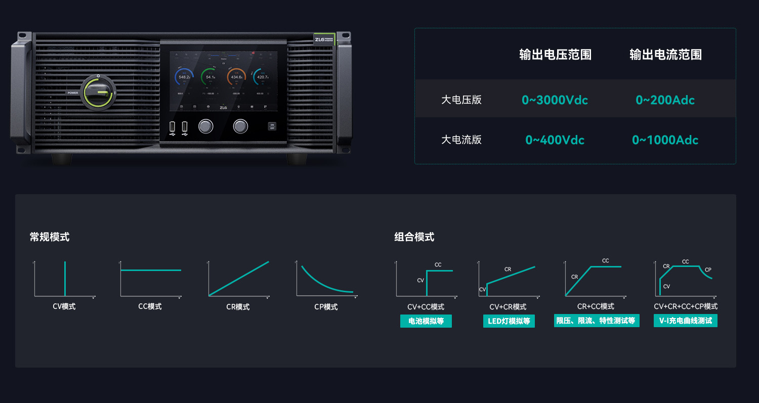 產(chǎn)品平臺分為寬電壓小電流、寬電流小電壓兩個系列,電壓輸出范圍0~3000V,電流輸出范圍0~1000A;且源載雙向均支持可編程輸出,如CC、CV、CR、CP等,且支持多類型的輸出模式組合。