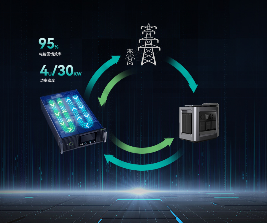 基于第三代半導(dǎo)體的電力電子能量變換技術(shù),采用雙向運(yùn)行的多級功率拓?fù)浣Y(jié)構(gòu),充分發(fā)揮功率器件的高壓高頻優(yōu)勢特性, 從而實(shí)現(xiàn)高達(dá)4U/30KW的功率密度,95%的電能回饋效率。