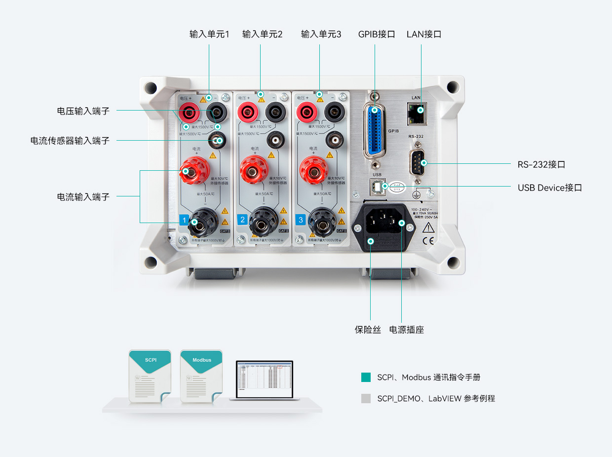 通訊接口是數據通訊的硬件基礎。PV300功率計標配LAN、GPIB、RS-232和USB Device接口,兼容SCPI、Modbus兩種通訊指令,保證了測試設備在自動化產線測試的系統集成中具備良好的兼容性。