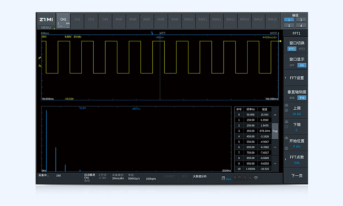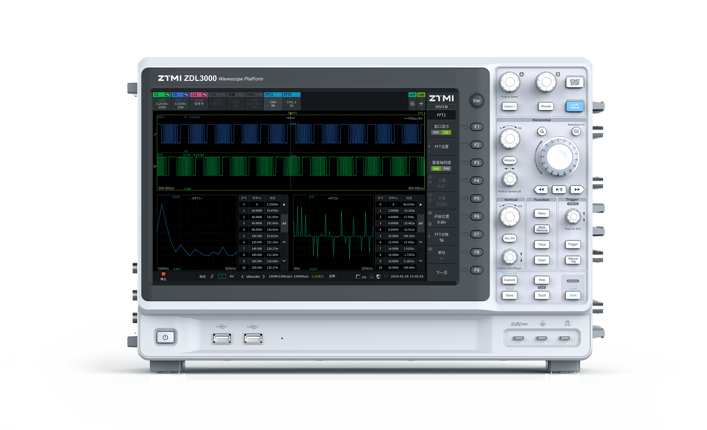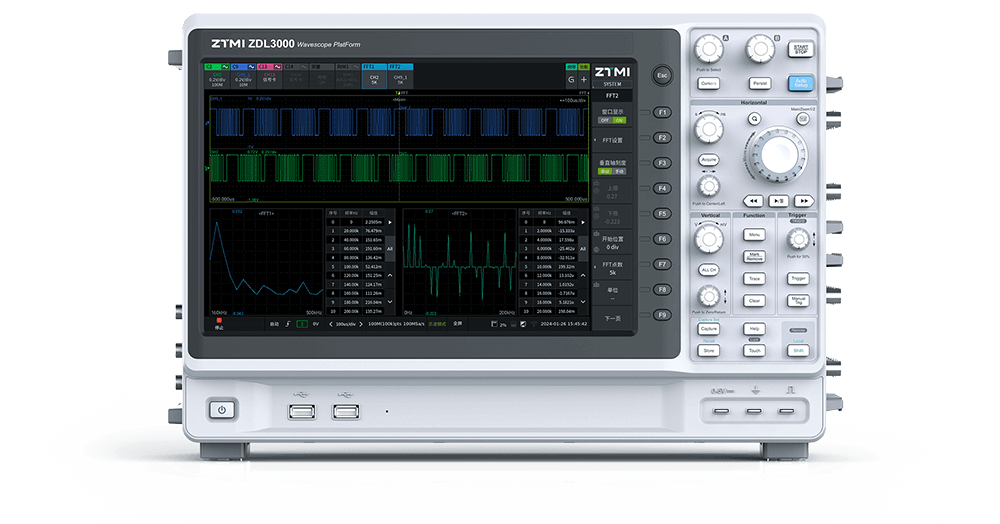 ZDL3000最高可通過100K點的FFT對信號進行頻譜分析,此功能不僅可以完成對頻域的定量分析,還支持頻譜查看和數值的實時查看與存儲。進一步還能使用光標對峰值進行自動捕捉。
