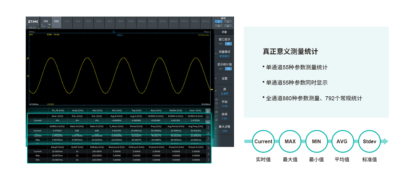 如果工程師用慣了示波器的參數測量統計功能,不用擔心,它被完全移植進入ZDL5000,共55種參數測量統計可以滿足絕大多數工程師的使用要求。