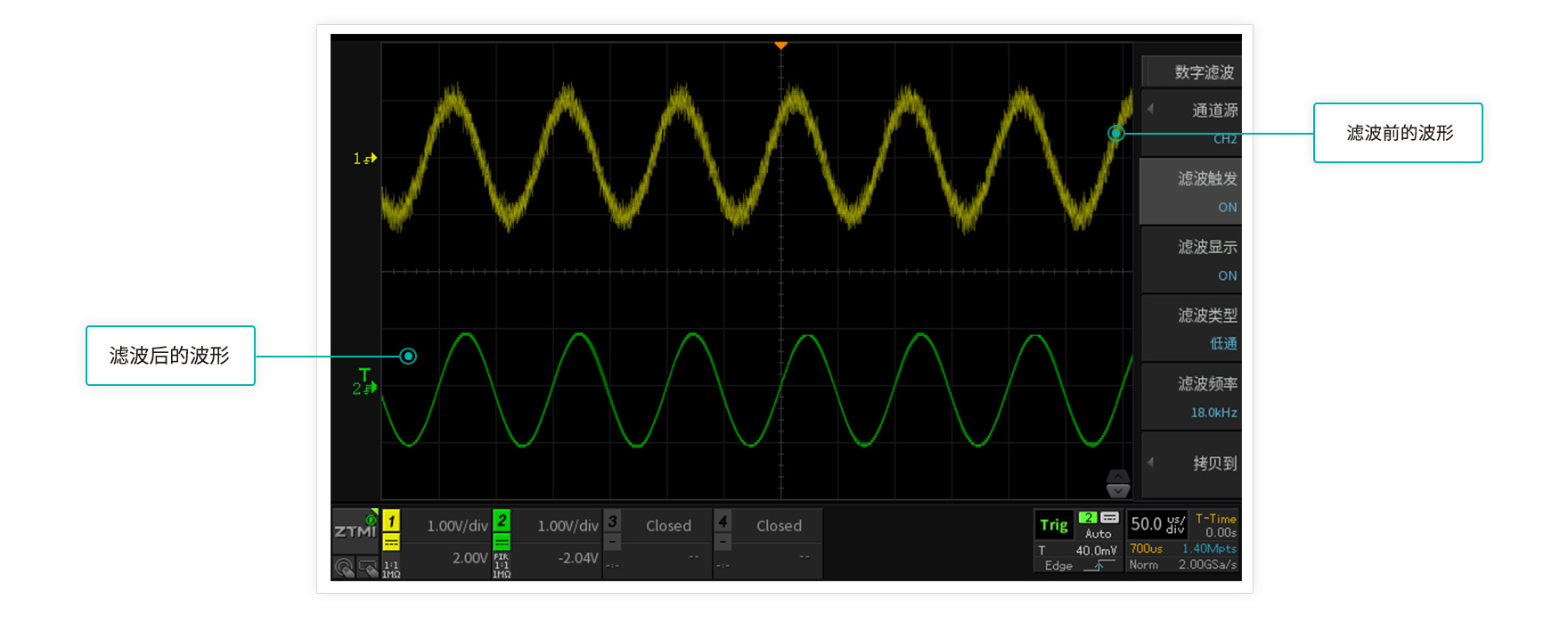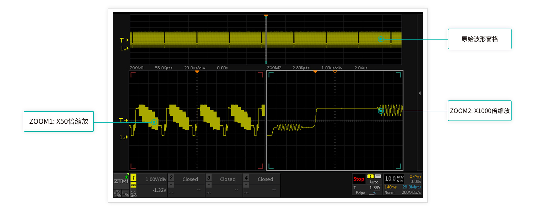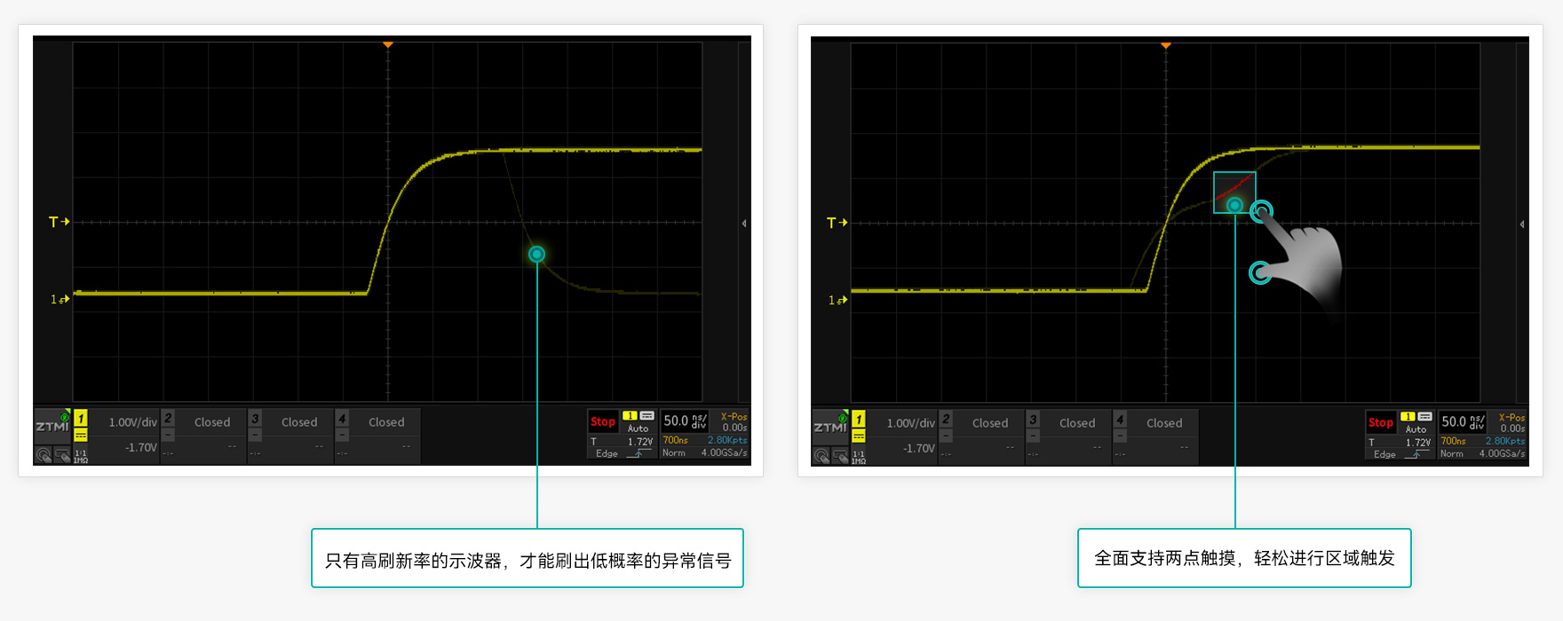 波形刷新率越高,死區時間就越短。ZDS4000系列示波器,標配1M次波形刷新率,配合模板觸發,讓您最大概率的發現并捕獲異常信號。