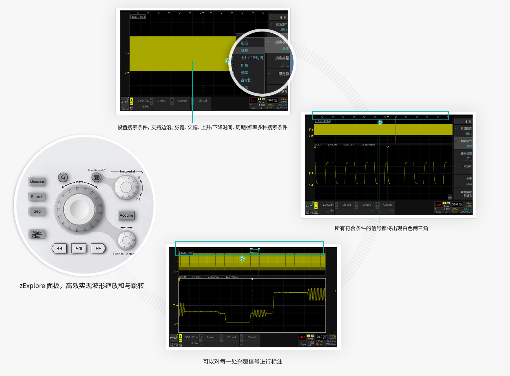 ZDS4000系列示波器不只提供了512M的波形大數據,還配有強大的波形搜索功能和智能標注功能。您可以先通過邊沿、脈寬、欠幅、上升/下降時間、周期/頻率等多種搜索條件來定位512Mpts波形數據中的異常點,再對找出的異常信號使用標注功能,對異常信號進行標注。這里,所有的測量都是經過FPGA全硬件加速,整個過程1S左右即可完成。再對找出的異常信號使用標注功能,對異常信號進行標注。