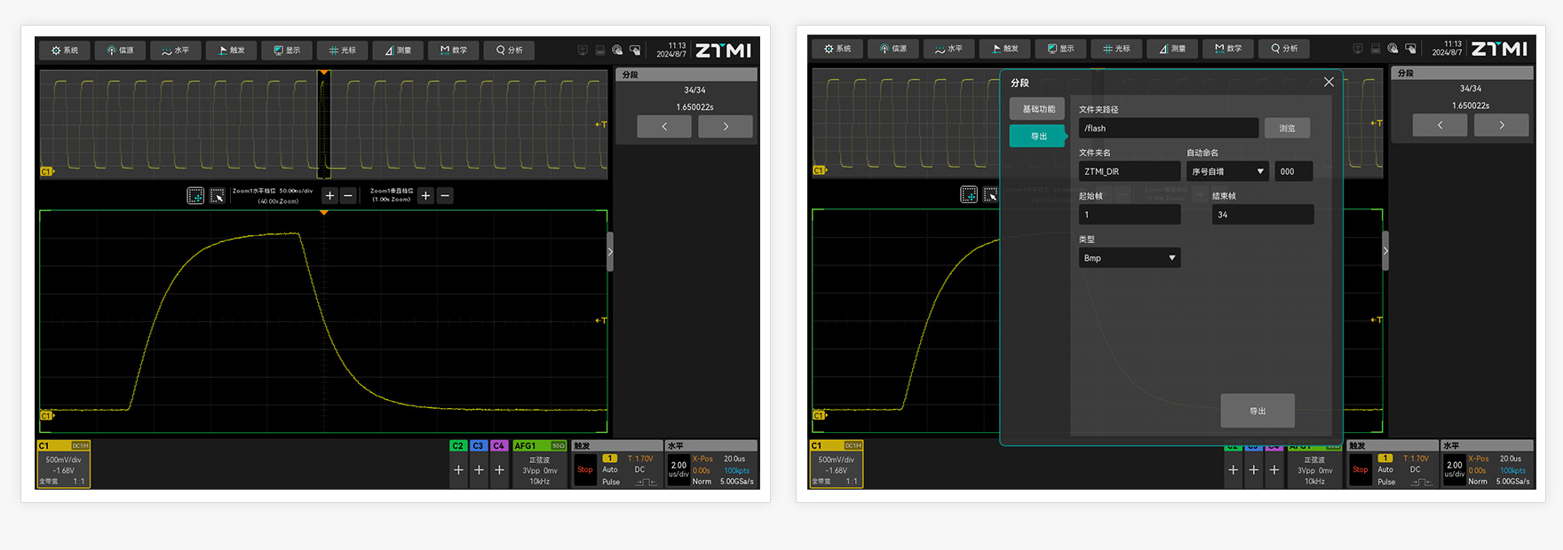ZUS5000示波器提供的分段存儲功能,結合示波器合適的觸發條件后,可實現特定波形的長時間在線監測,實現示波器本地進行歷史波形查看分析,并可通過數據導出方式導出歷史數據。
