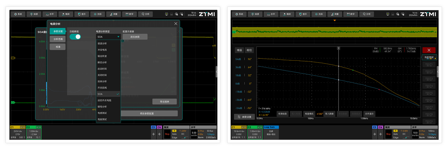 ZUS5000示波器提供的電源分析功能插件涵蓋了電源產品的輸入輸出特性測試,MOSFET、磁性元件、電容、電感等器件分析,調制波形測試,以及環路分析,PSRR測試分析,全方位評測電源產品的可靠性。
