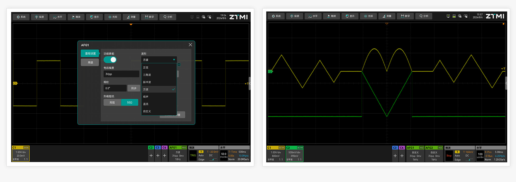 ZUS5000示波器內置雙通道函數信號發生器,支持正弦波、三角波、方波、脈沖波等標準函數信號輸出,可調節信號初始相位、功能類型(掃頻、調制、猝發)、占空比,頻率最高可達30MHz。