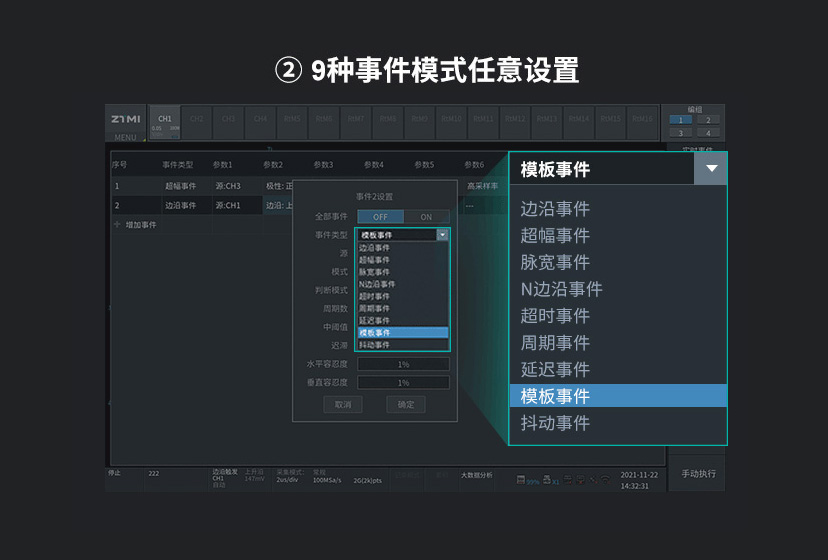 實時事件是ZDL6000示波記錄儀最先進的功能,這是一種可以使示波記錄儀運行在波形滾動模式下無死區(qū)地對波形進行實時條件判定的功能,當(dāng)滿足觸發(fā)條件時,可對觸發(fā)點前后各一段波形進行數(shù)據(jù)存儲,大大節(jié)省存儲空間和查找異常波形的時間。