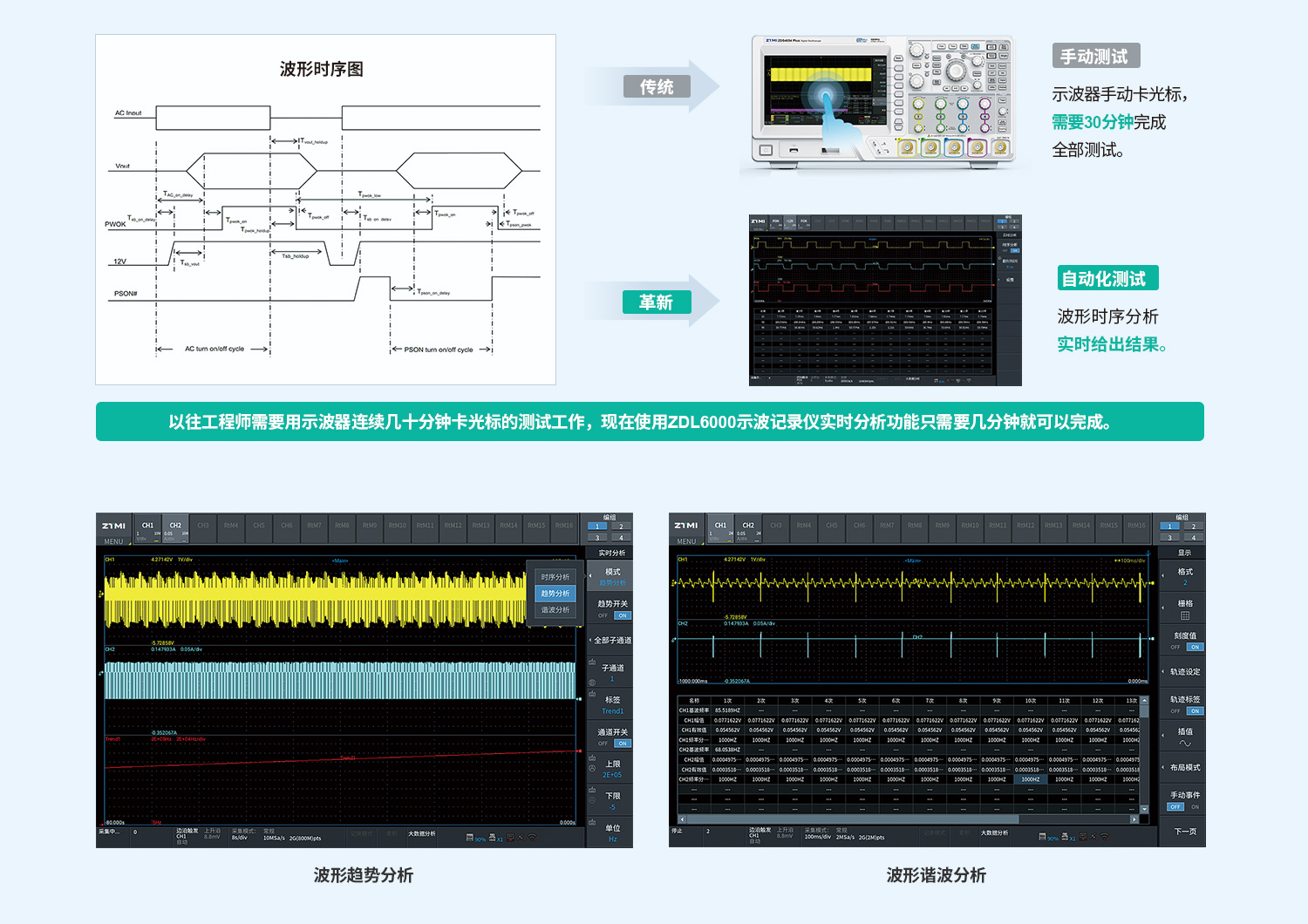 實時分析是ZDL6000示波記錄儀最智能的功能,它可以在滾動模式下實時對屏幕中的波形進行分析運算,它可以幫助用戶在長時間的重復(fù)性測試中,以自動化的機器測試代替重復(fù)性的人工測試,大大提高了測試效率。實時分析功能包含了波形時序分析、波形趨勢分析以及波形諧波分析。