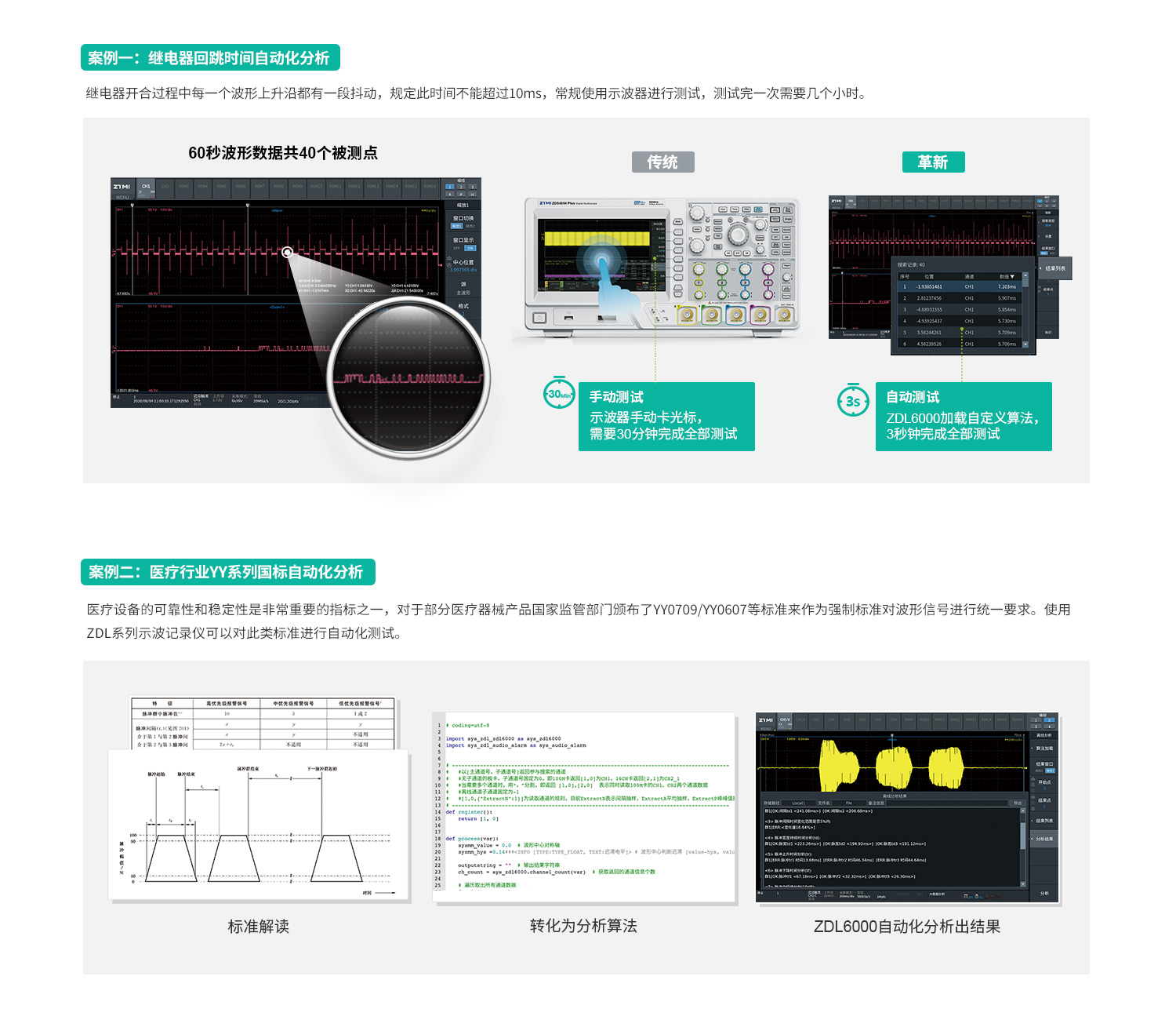 大數(shù)據(jù)分析是ZDL6000示波記錄儀最靈活的功能,他打破了傳統(tǒng)儀器在設(shè)計時只保有固定的分析方法和觸發(fā)方案,大數(shù)據(jù)分析允許用戶加載自定義的分析算法,尤其是面對固定的測試標(biāo)準(zhǔn)(典型如國標(biāo)測試、IEC標(biāo)準(zhǔn)等)或者有規(guī)律的測試方法時,它將可以大大提高數(shù)據(jù)分析的效率。
