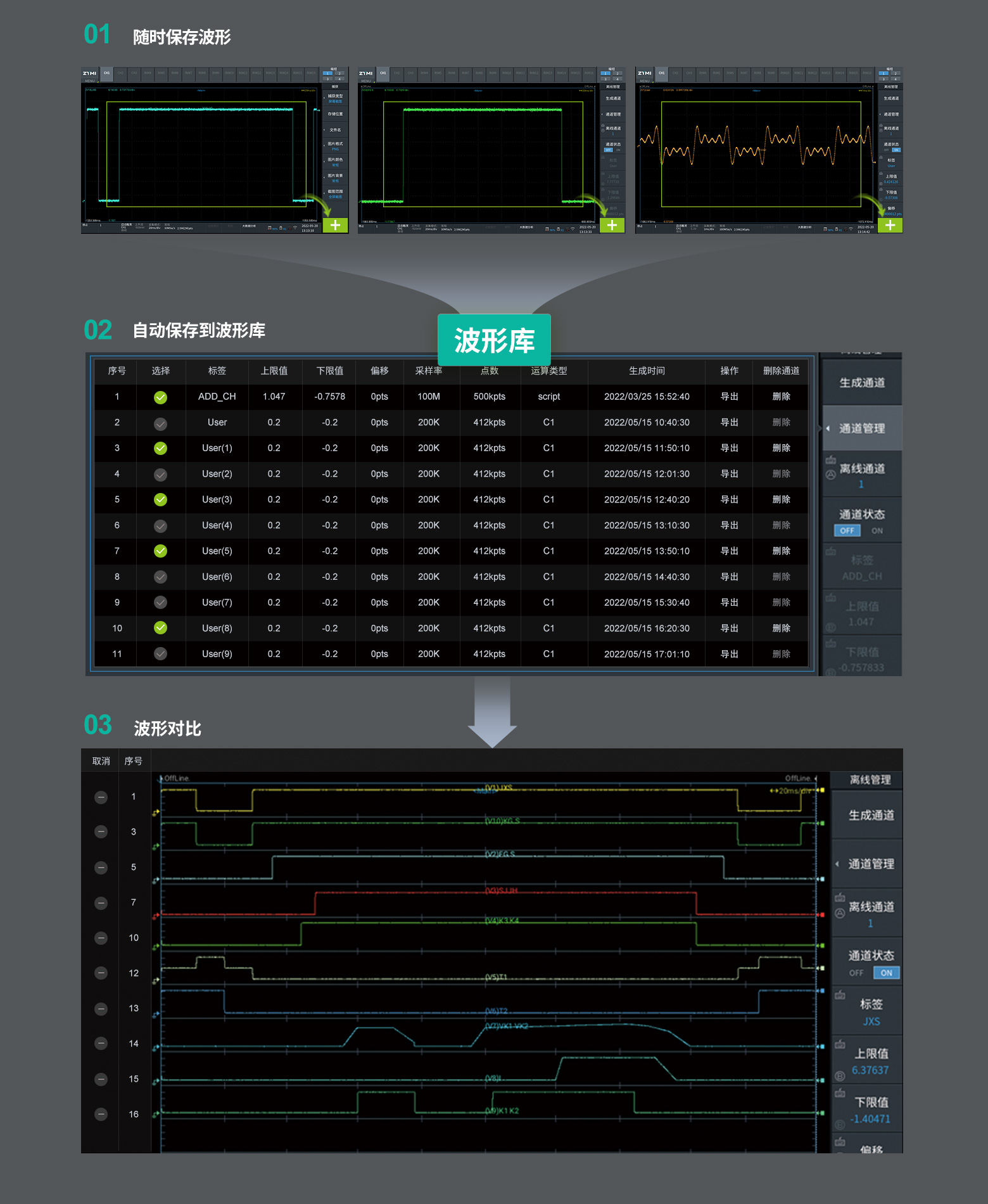 波形對比功能是ZDL6000示波記錄儀最具創(chuàng)意的功能。它允許用戶隨時隨地的保存屏幕中的波形到波形對比庫,用戶可以方便的將所有保存的波形進行對比分析,觀察波形走勢以及差異化。