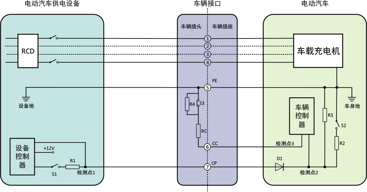 S1一供電設(shè)備內(nèi)部 PWM 信號切換開關(guān); S2一車輛內(nèi)彭控制導(dǎo)引電路開關(guān); S3一車輛插頭內(nèi)部常閉開關(guān); RCD可采用與供電設(shè)備集成或分立安裝的形式 |